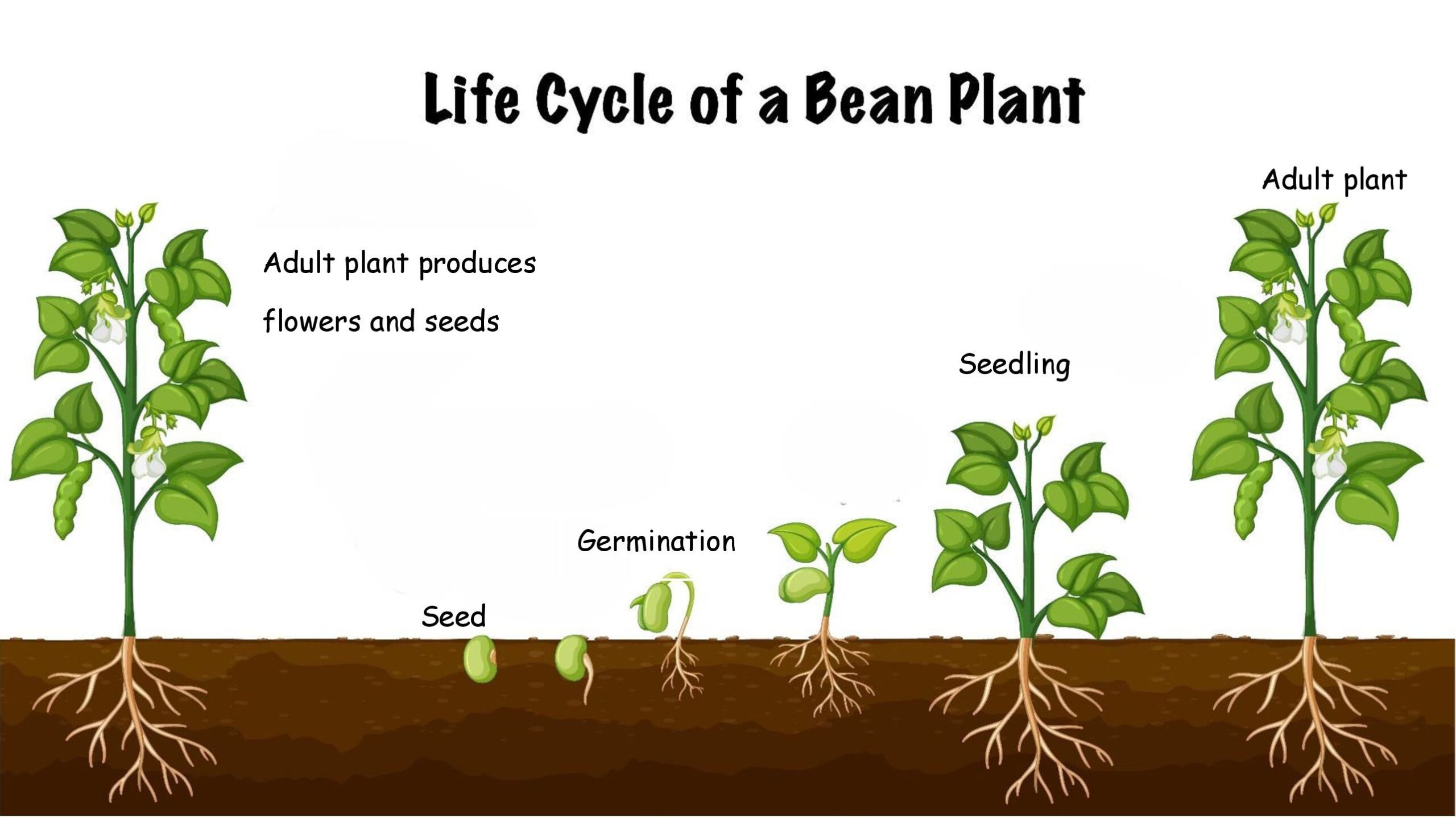 Flowers help plants reproduce. To reproduce means to make more of your own kind. When flowers are fertilized, they make seeds. These seeds can then grow into new plants. This is known as the life cycle of a flowering plant. Bean plants are flowering plants. Look at the life cycle of a bean plant below.
