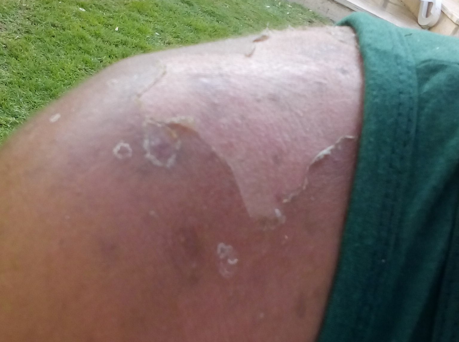- Sunburn: If you are in the sunlight for a long time, UV radiation can cause sunburn. In the picture below you can see someone’s skin peeling off after getting a sunburn.