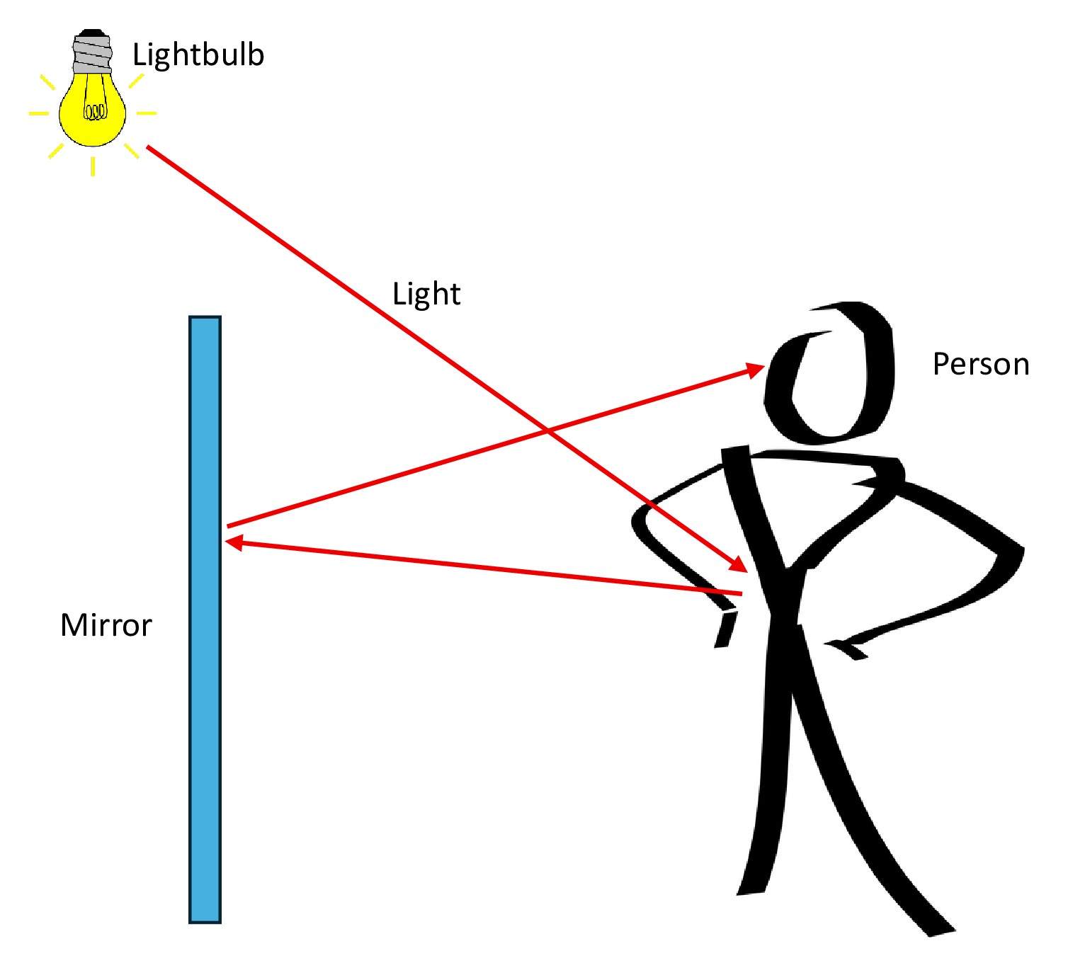 When you look at yourself in a mirror or another similar surface, you are looking at your reflection. Light reflects off your body to the mirror. Then it reflects into your eyes. This can be seen in the diagram below.
