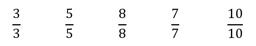 Look at the fractions below. Each one has a numerator which is equal to the denominator. They are also improper fractions. Any fraction with a numerator that is equal to the denominator represents the whole.